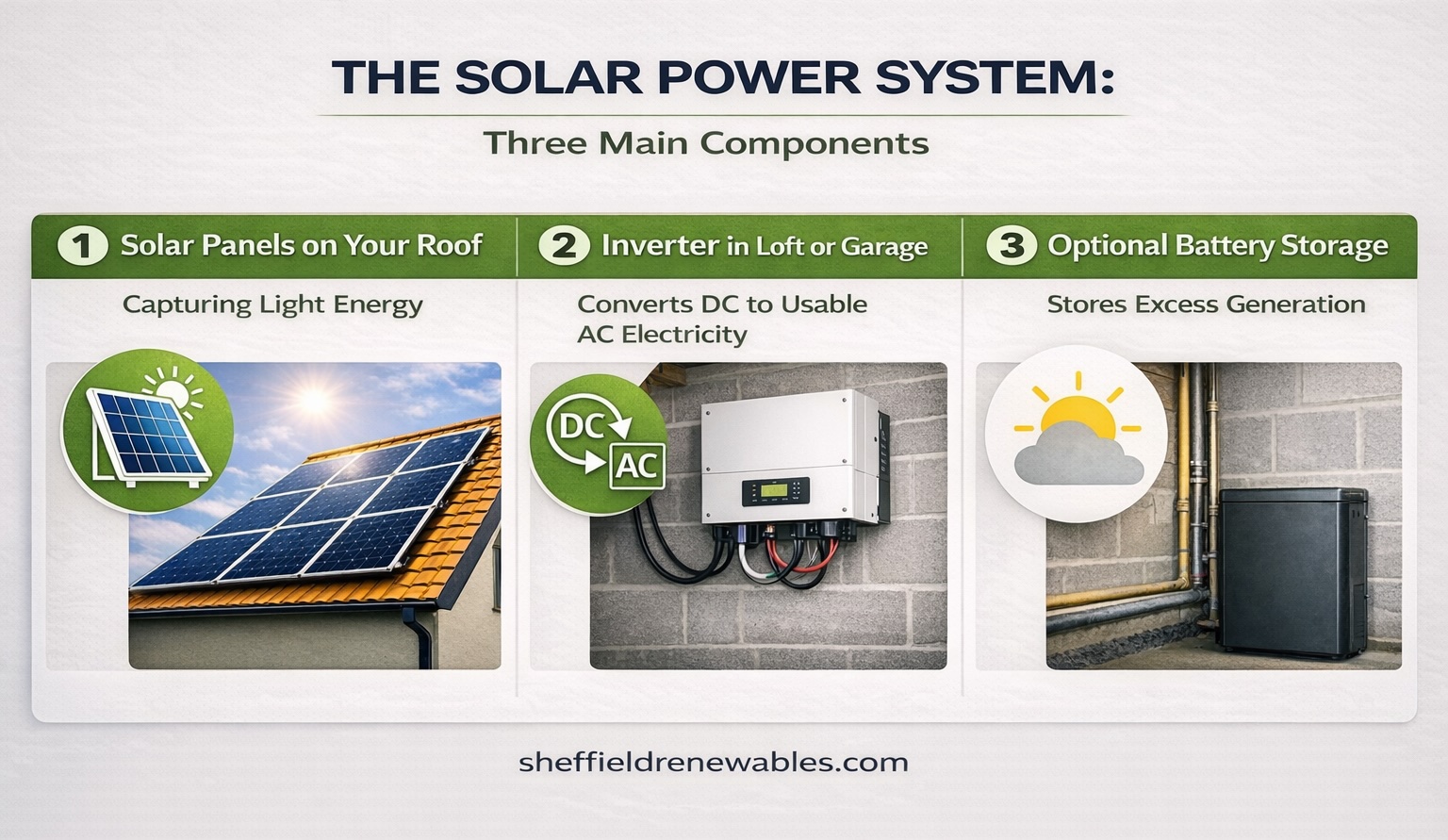 - The inverter (usually mounted in your loft or garage) converts DC to usable AC electricity.